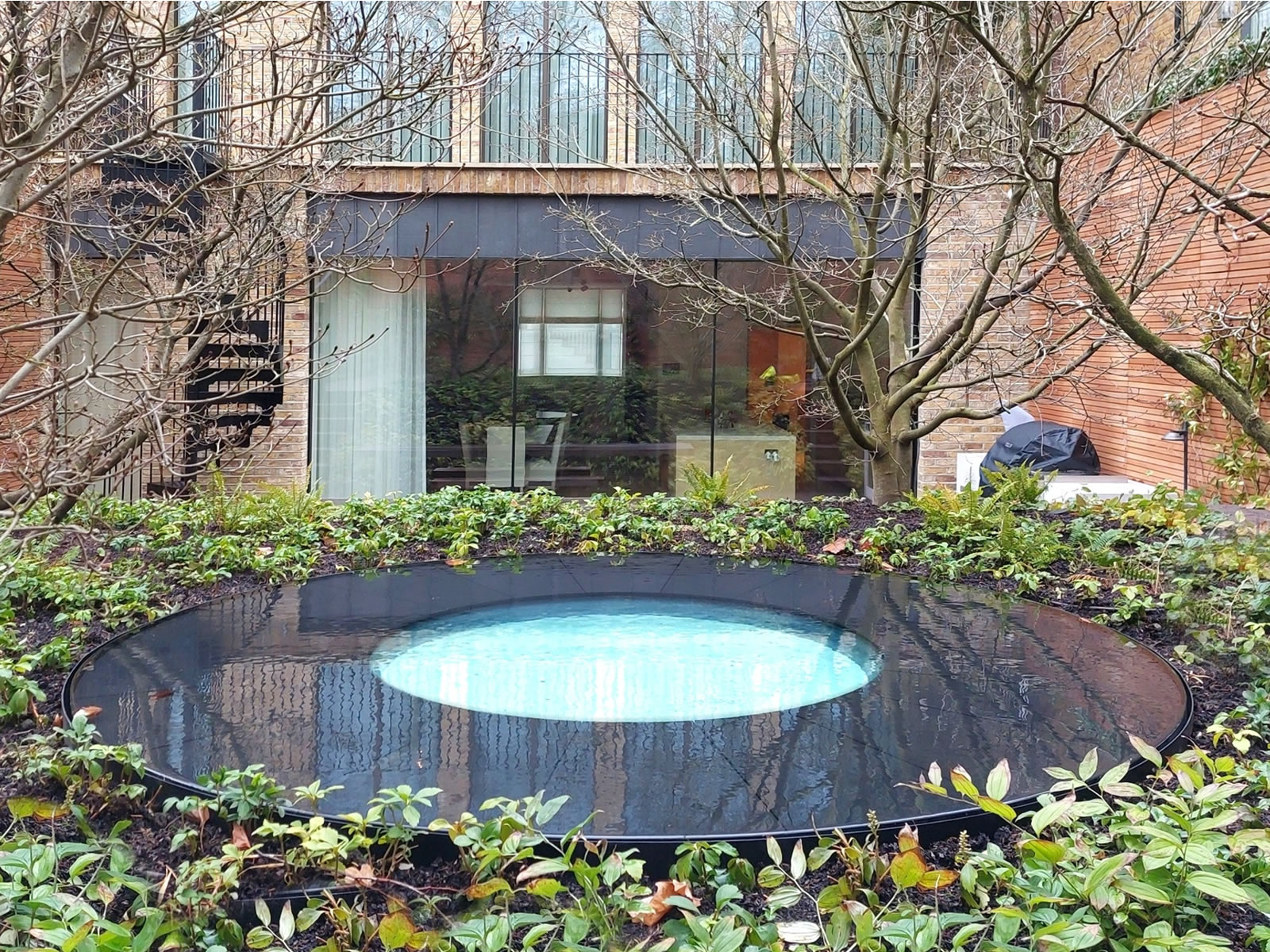 Internally illuminated by fibre-optics, fountains bubble from a water-covered black granite surface. The water feature covers the whole floor space of an internal courtyard of a penthouse overlooking the Thomas Hetherwick conjoined coal shed roofs in the fashionable Kings Cross area of north London. The fountain design includes raised granite stepping stones leading to a central spiral staircase which ascends to a roof terrace. This water feature is a Fountainhead collaboration with Stefano Marinaz Landscape www.stefanomarinaz.com and Jonathan Tuckey Design www.jonathantuckey.com .